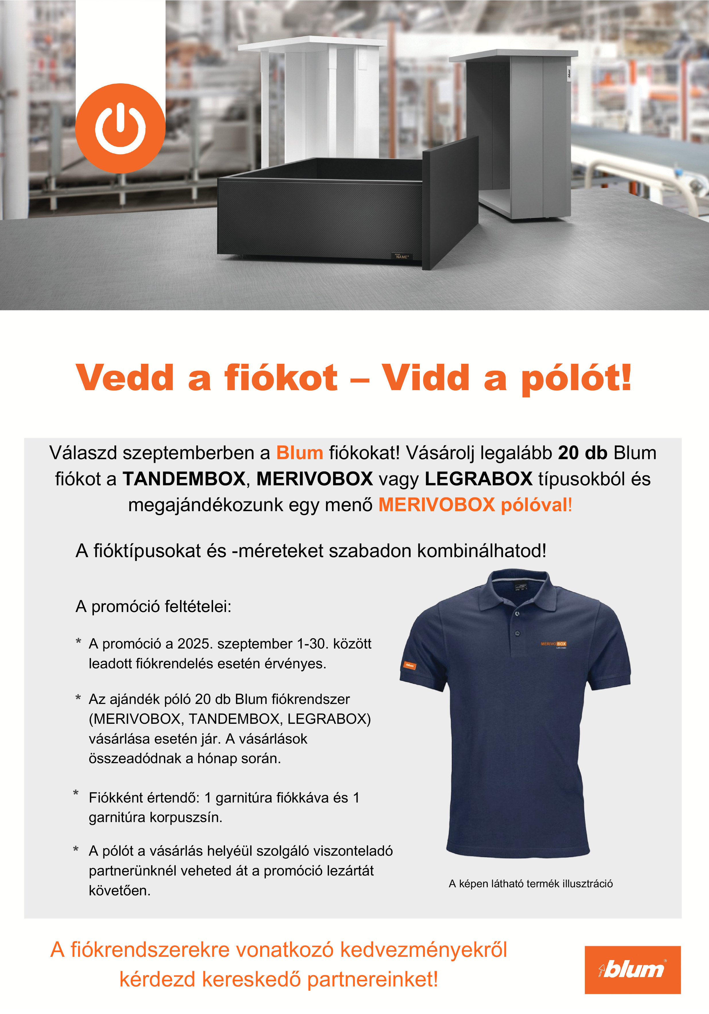Aki 2025.09-01 és 2025.09.30 között megvásárol legalább 20 db Blum fiókot a TANDEMBOX, MERIVOBOX vagy LEGRABOX típusokból, az ajándékba kap egy MERIVOBOX logóval ellátott sötétkék galléros pólót. A mennyiséget nem egyszerre kell vásárolni, hanem a promóciós időszak alatt összesen és a három típus bármilyen kombinációjából összeállhat. Aki a 20 darabos mennyiség többszörösét rendeli, több ajándékra jogosult. A nyeremény átvételének a feltétele hogy a vásárlás számlával vagy szállítólevéllel legyen igazolva.